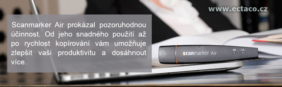 Zapomeňte na klasický způsob skenování. Ruční skenery ScanMarker Air jsou jediné v České republice, které skenují text a přenášejí skenovaný text jako textový soubor. Jednoduše pokud skenuji tištěný text (smlouvu, fakturu, knihu, dokument ) text přenášený při skenování se v textových programech znázorňuje ne jako forma PDF, ale jako psaný text a rovnou s tímto naskenovaným textem mohu pracovat. Čas mezi skenováním a znázorněním v PC není delší než 3 vteřiny. Pokud přicházíte do styku s tištěným textem a složitě jej přepisujete do PC nebo telefonu s operačním systémem android, tento ruční skener Vám ušetří spoustu času.