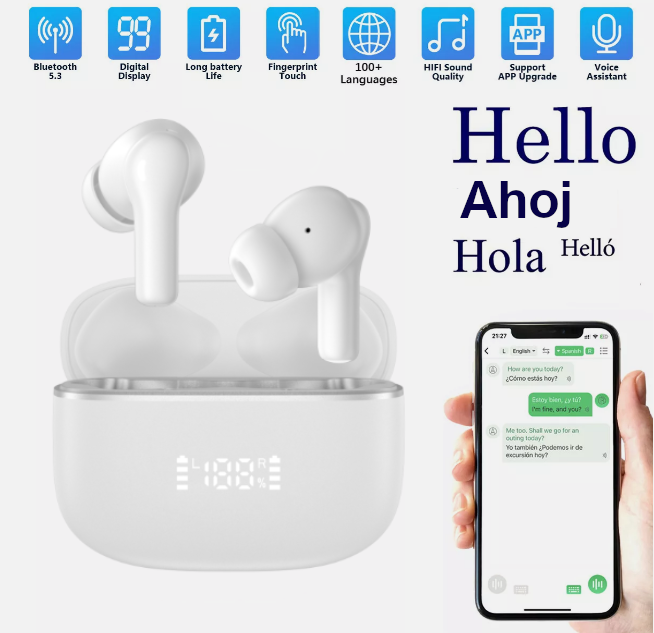 Tato bezdrátová sluchátka jsou vaší vstupenkou do světa bez jazykových bariér. 144jazyčný vestavěný překladač vám zajistí, že budete v každé zemi sami sebou.